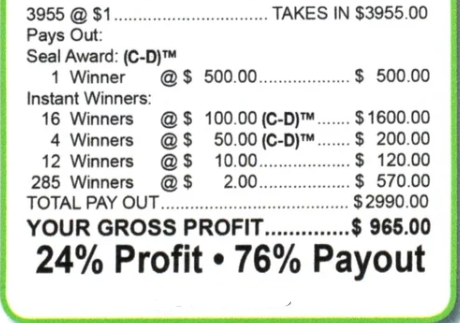 Uncover the thrill with our Instant Chip pull tabs, featuring $1 tickets in a 3955 count set. The grand prize is an exhilarating $500 with a total profit potential of $1,055!